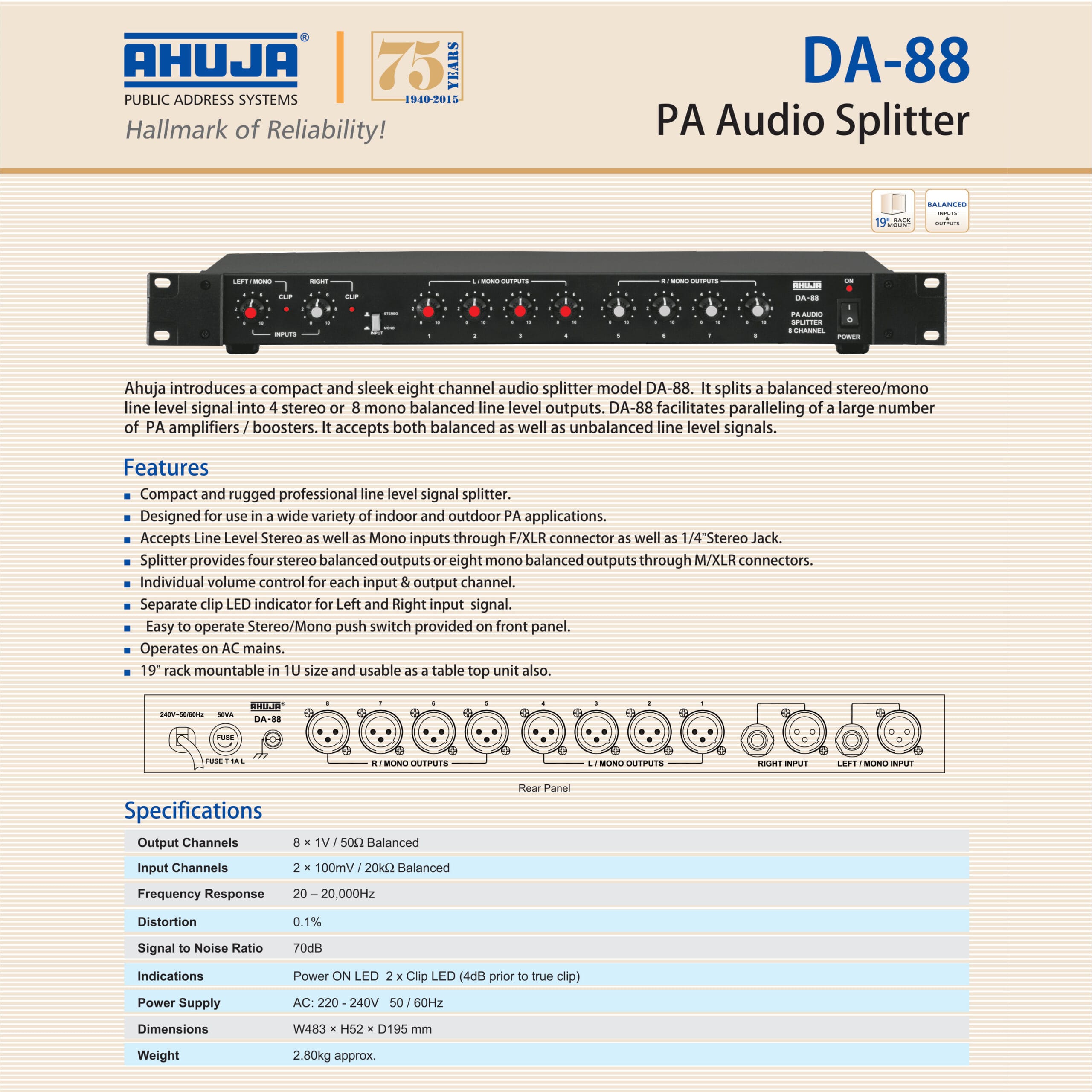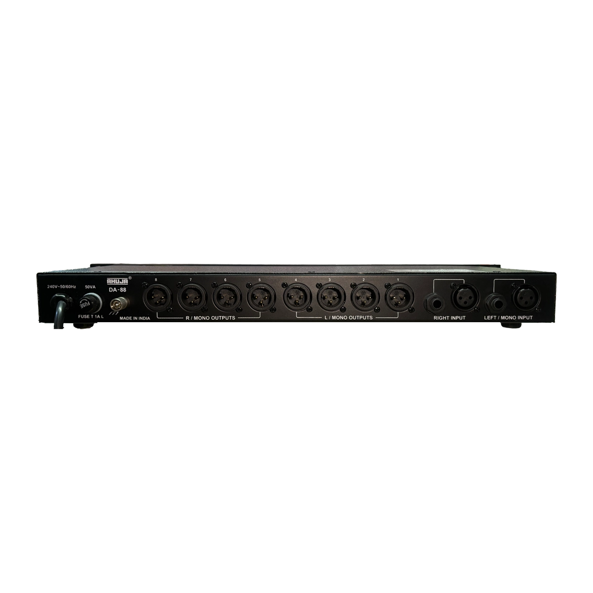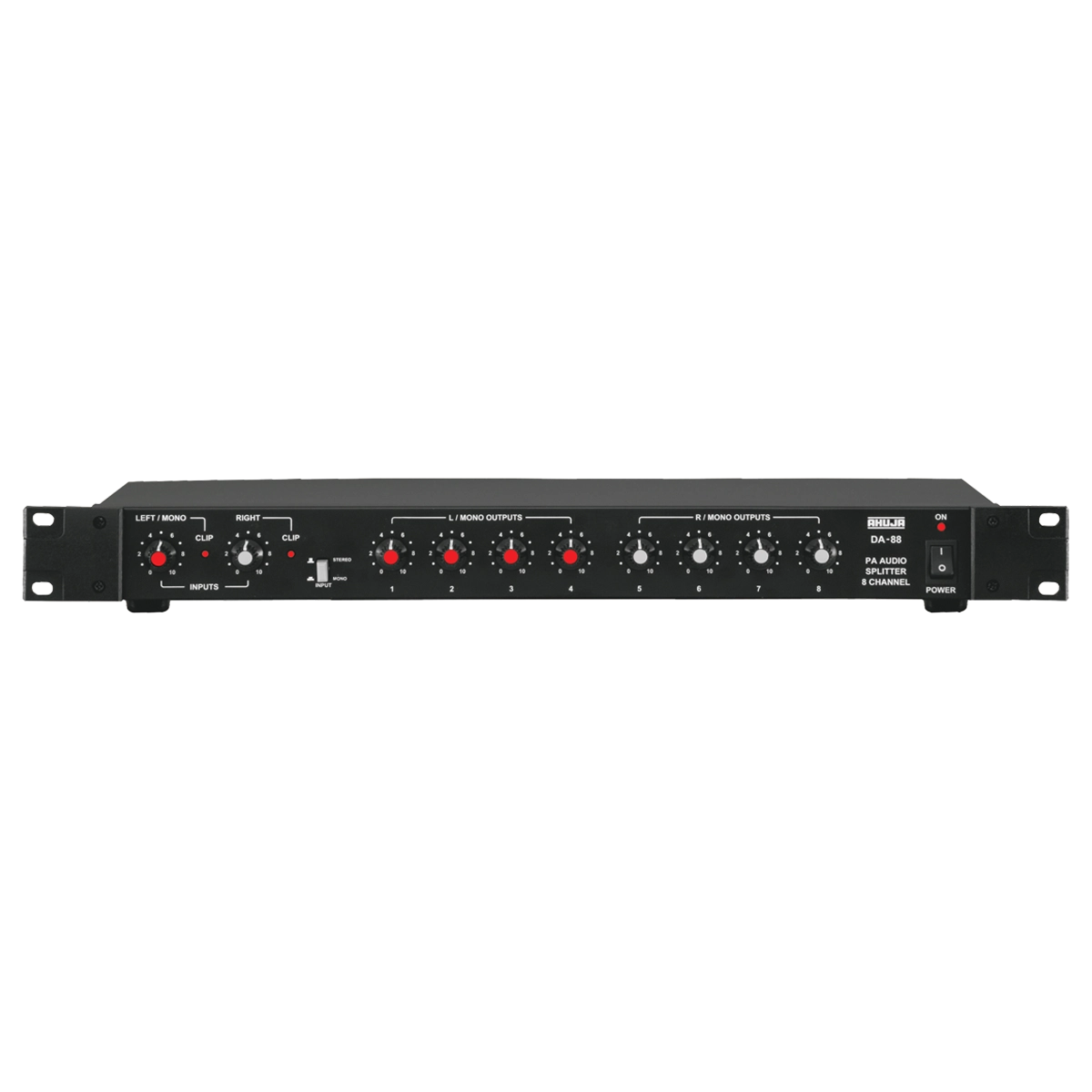 The Ahuja DA-88 Audio Splitter is a compact and rugged professional solution for splitting line-level signals in both indoor and outdoor PA applications. Featuring versatile connectivity, it accepts stereo or mono inputs via F/XLR connectors and 6.3mm (1/4”) stereo phone jack sockets. It delivers up to four stereo balanced outputs or eight mono balanced outputs through M/XLR connectors, with individual volume control for each channel. Equipped with clip LED indicators for left and right inputs, a convenient Stereo/Mono push switch, and reliable AC mains operation, this 19” rack-mountable 1U unit can also be used as a tabletop device—making it an ideal choice for professional audio setups.